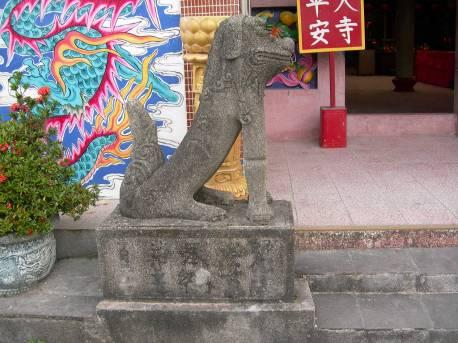 石狗為神社的地靈,與台灣廟宇門前安立石獅子的意義大致相同,且擺設方式亦雷同(公左、母右),只是石獅子面部均朝門外,而石狗卻是兩相對望著,目前國內似乎只剩碧蓮寺這對石狗保持得最完整,石狗基座,原刻有紀述文字,同樣的亦遭水泥塗抹,無法恢復文字原貌,神社石狗的由來,雖與宗教信仰沿習有關,但有另一說法是,日人為了表彰征東大將軍「豐成秀吉」的功勳,為其立神社時,亦將他隨侍身旁的愛犬,立像於神社前守護陪伴著他,因此也成為日人爾後興建神社時仿效的模式。